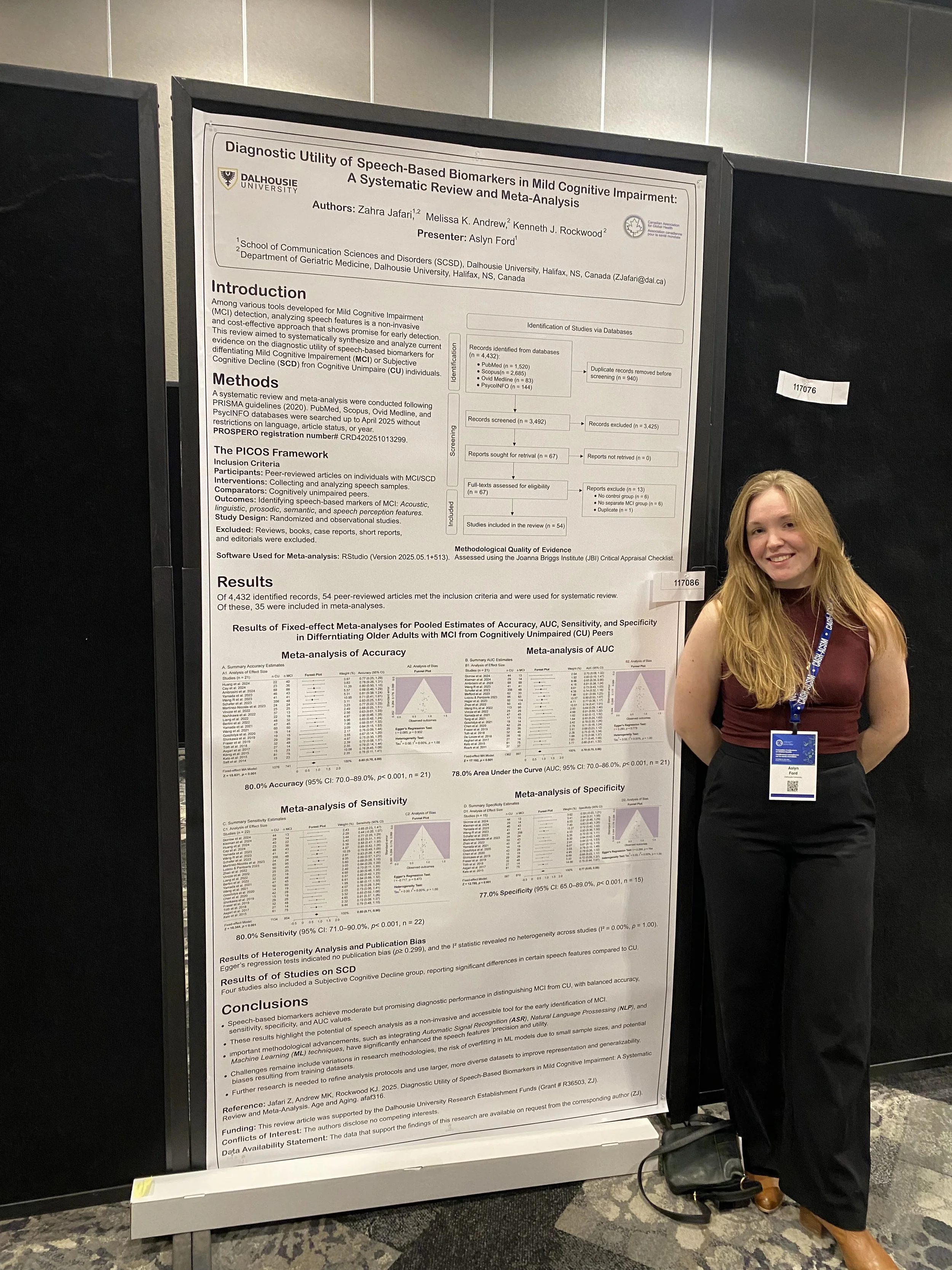 Aslyn Ford, the first-year Master’s student in Speech Language Pathology, presented our work, “Diagnostic Utility of Speech-Based Biomarkers in Mild Cognitive Impairment: A Systematic Review and Meta-Analysis”, at the 2025 Canadian Conference for Global Health (CCGH2025), held from October 24–28, 2025, at the Halifax Convention Centre.